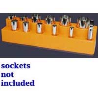3/8" Dr Impact Deep Socket Organizer w/ Magnetic Base - Solar Orange 12 hole design for semi-deep & deep chrome or impact sockets. Accommodates 3/8 thru 3/4 SAE. Magnetic base holds tools in holder & holder to work surface. Strong enough to hold upside down. Magnetic material is non-transferable. Magnetic material will not magnetize tools or damage on-board automotive computers & other related circuitry. Fuel/oil resistant non-stick high impact plastic. Fits most tool boxes & drawers. Easily tranferable from tool drawer to work area.